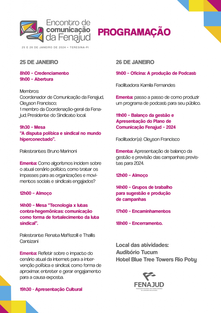 A FENAJUD – Federação Nacional dos Trabalhadores do Judiciário nos Estados, em parceria com o Sindsjus-PI, promove de 25 a 27 de janeiro uma vasta programação de atividades sindicais, em Teresina (PI). A primeira delas é o XII Encontro de Comunicação e a segunda é o XIV Encontro Nordeste da entidade. Os eventos reunirão dirigentes e profissionais da comunicação da base da Fenajud e dos estados da região.