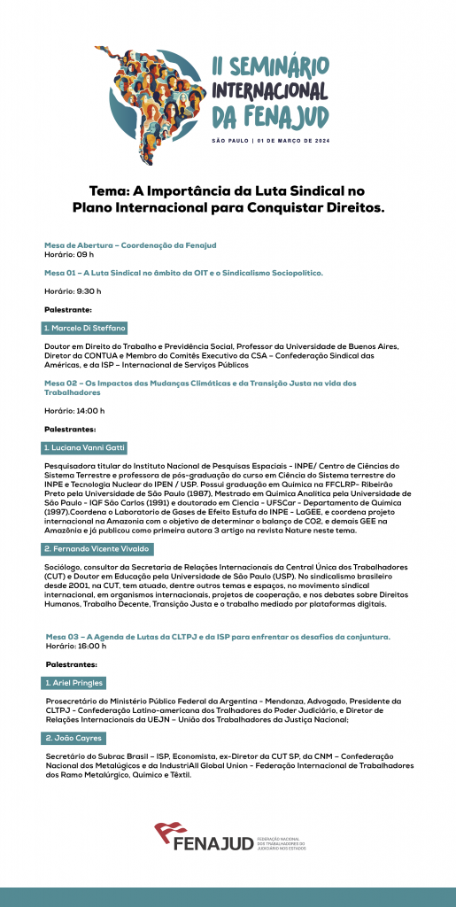 O estado de São Paulo sediará três atividades da FENAJUD – Federação Nacional dos Trabalhadores do Judiciário nos Estados – o Coletivo Jurídico (29/02), o Seminário Internacional (01/03) e o Conselho de Representantes (02/03), objetivando a construção de debates técnicos e políticos acerca de direitos dessa categoria. E a Fenajud, que tem expectativa de receber representantes das entidades afiliadas e das assessorias jurídicas divulga abaixo as programações de cada atividade. Confira: