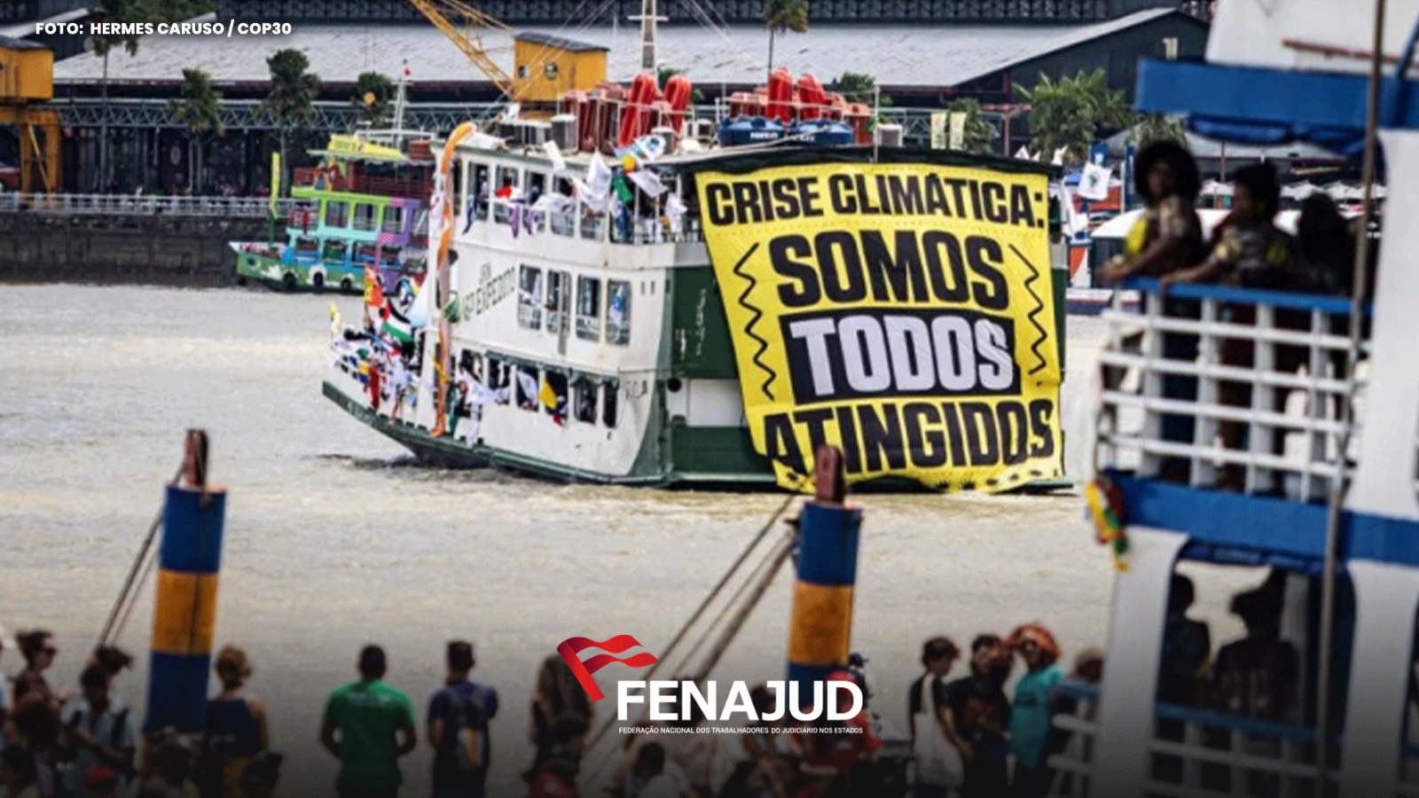 A Cúpula dos Povos acontece em Belém (PA), com uma barqueata pela Baía do Guajará que reuniu milhares de manifestantes em defesa da Amazônia e da justiça climática. O ato marcou a abertura oficial do evento, que ocorre paralelamente à 30ª Conferência das Nações Unidas sobre as Mudanças Climáticas (COP30), reunindo mais de mil movimentos sociais e organizações populares de 62 países. A Fenajud (Federação Nacional dos Trabalhadores do Judiciário nos Estados) está presente na mobilização por meio da coordenadora da Regional Norte, Danyelle Martins, que participa das atividades representando a entidade e reafirmando o compromisso da entidade com a justiça ambiental, a defesa dos direitos humanos e da soberania dos povos.
