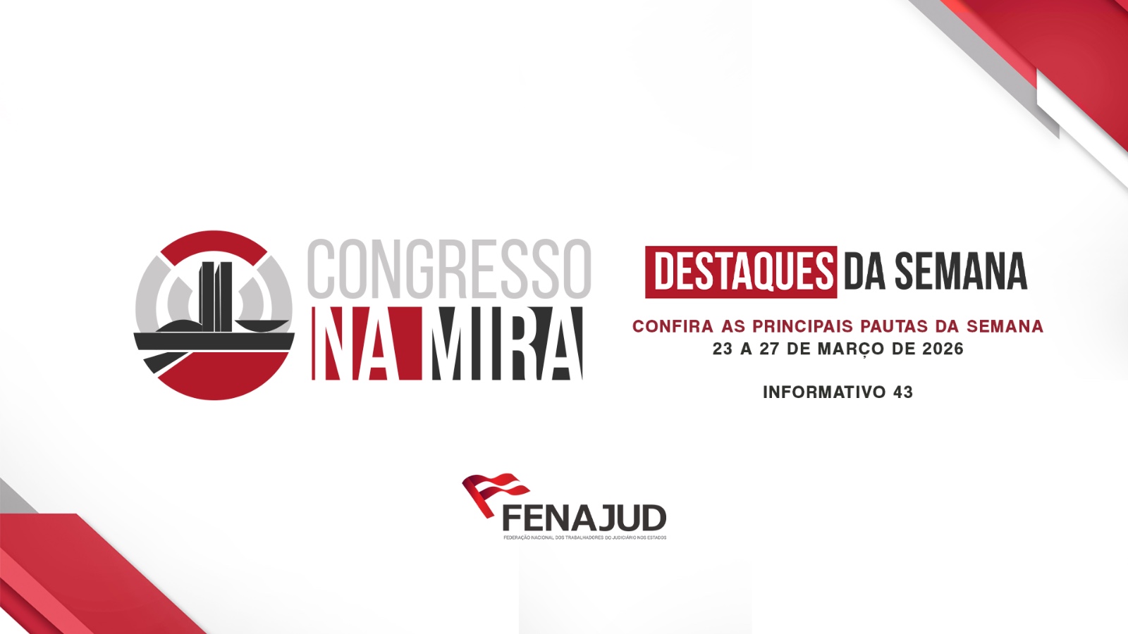 A Fenajud – Federação Nacional dos Trabalhadores do Judiciário nos Estados divulgou nesta semana a quadragésima terceira edição do Informativo “Congresso na Mira”, referente aos dias 23 a 27 de março, com objetivo de manter a categoria e os sindicatos filiados sobre os principais projetos de lei e debates que impactam os servidores do Judiciário em nível nacional. O boletim traz informações detalhadas sobre a tramitação de pautas de interesse da categoria e os desafios enfrentados no Congresso Nacional.